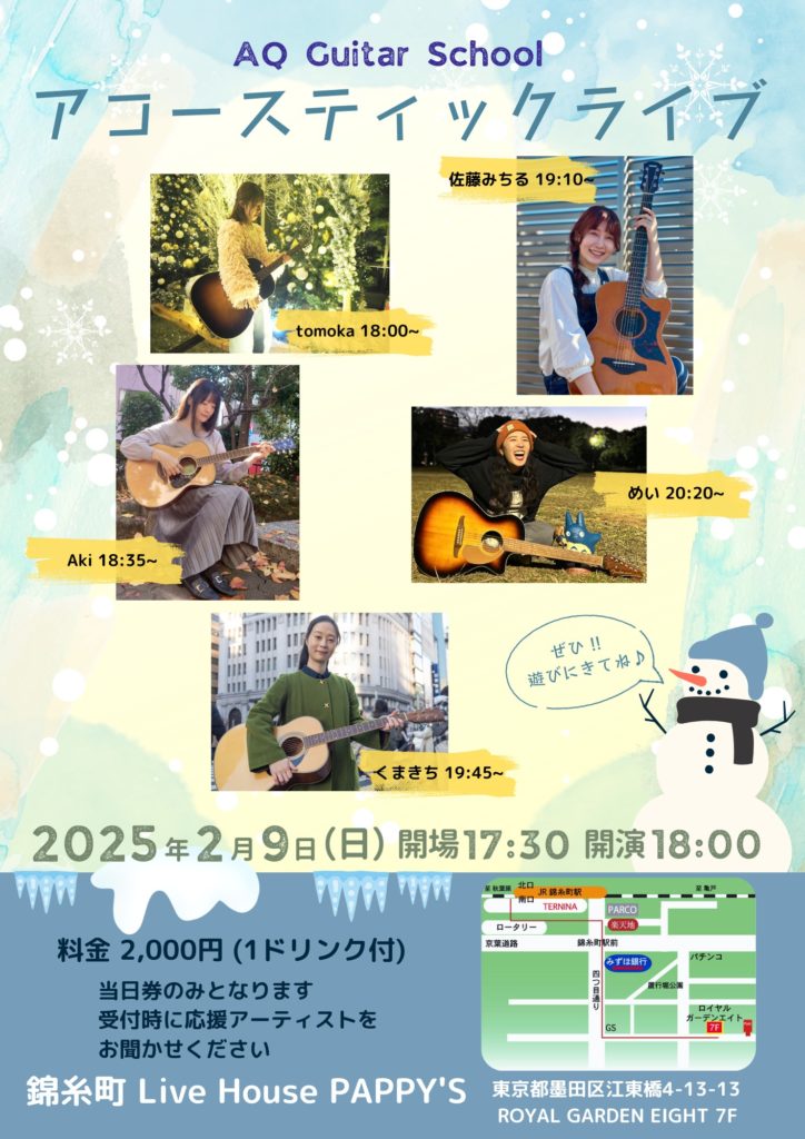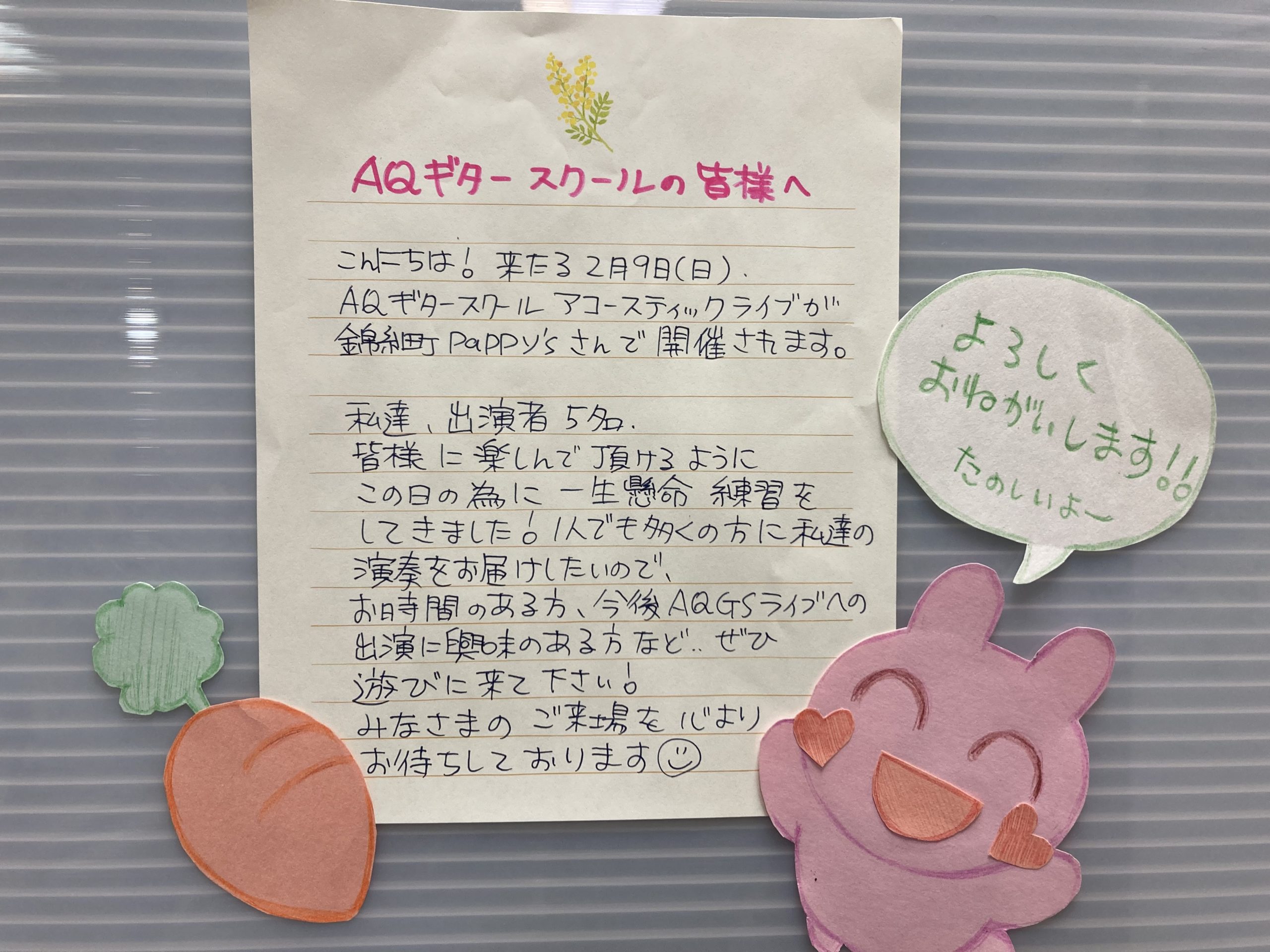 運営会社について ギター触ったことなくても大丈夫 講師について 開講日・時間 料金・Q&A 教室の風景 アクセス 申込み・お問合せ かわいいポップ(^^) ライブ情報 2025.02.05 2/9(日)に開催される『AQGSアコースティックライブ2025』に出演する「みちるさん」から、かわいいポップいただきました!教室に飾ってありますー。みんな応援に来てください~(^^)/※チケットは当日券のみです。予約は必要ありません。2025年2月9日(日)『AQGSアコースティックライブ2025』17:30開場⇒18時開演錦糸町PAPPY’S(墨田区錦糸町江東橋4-13-13 7階)チケット:¥2,000(1ドリンク付き)よろしくお願いします~♬tsuguma
