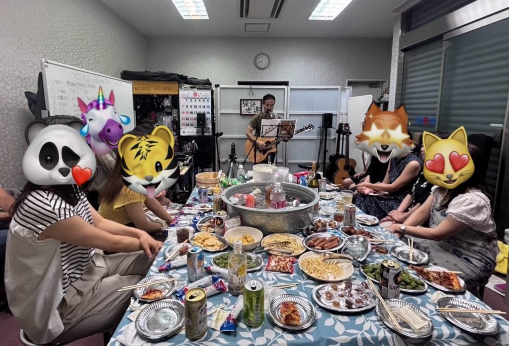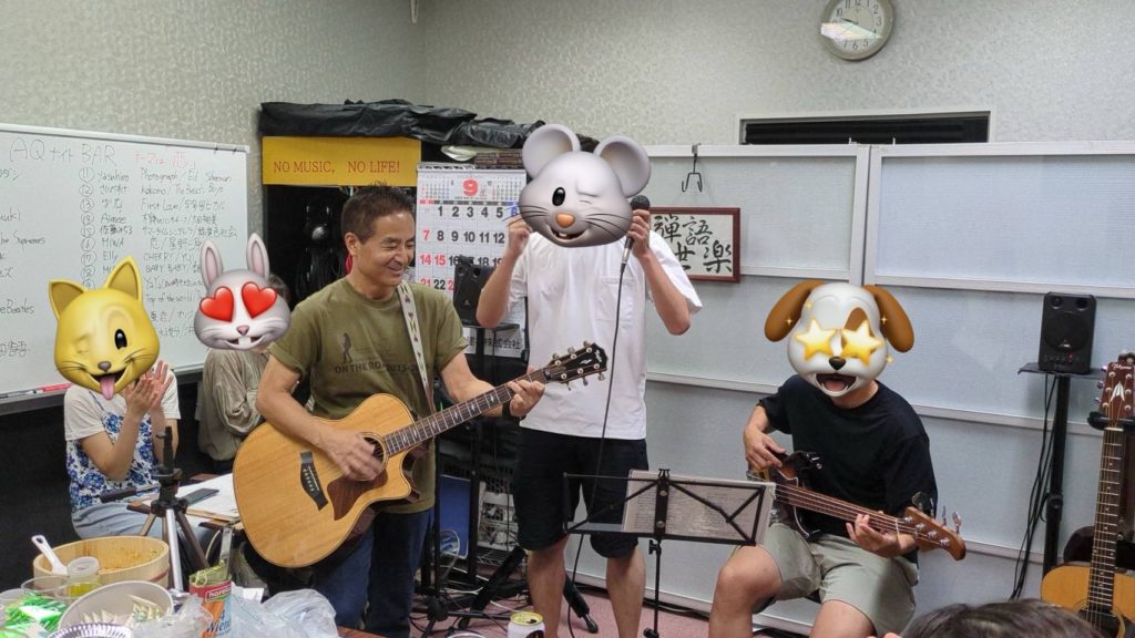 教室をBAR化して(大人限定。笑)、みんなで1曲づつオープンマイク形式で弾き語りしつつ、、、途中『歌声喫茶』にもなる、という不思議な不思議な空間でした。