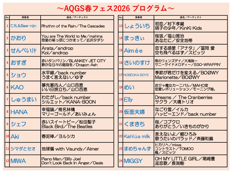 今月3/22(日)に通算24回目となる教室の発表会『AQGS春フェス2026』を開催します!
